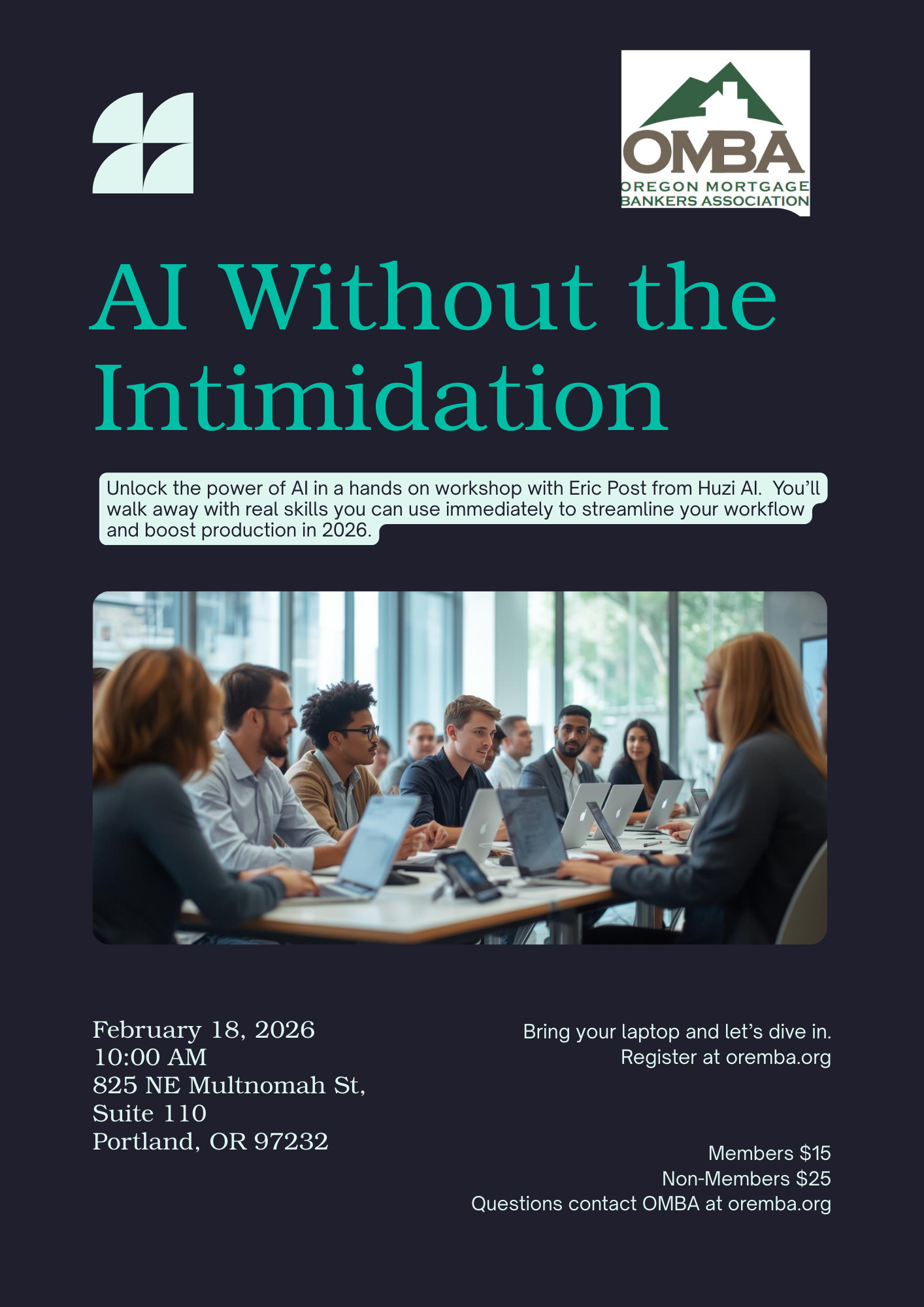 ![]() AI Without IntimidationWednesday February 18, 2026 Event Starts at 10:00 am 825 NE Multnomah St. Suite 110 Registration Member: $15 Non-Member: $25 Register Here! |